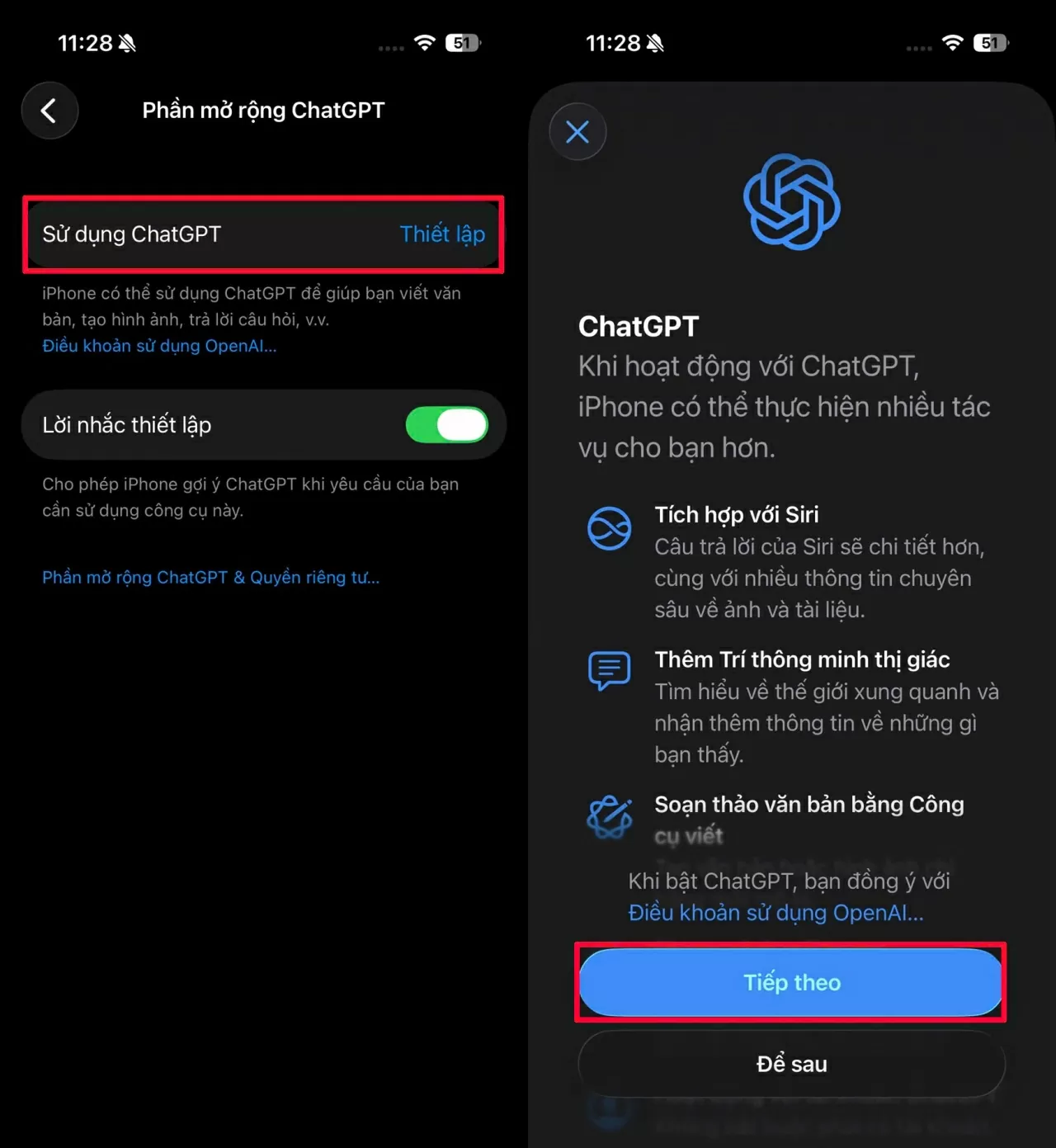 Bước 2: Ở bước này, bạn chọn Sử dụng ChatGPT để tiến hành kích hoạt. Tiếp theo, nhấn Tiếp tục để hệ thống cho phép Apple Intelligence kết nối trực tiếp với ChatGPT – giúp trợ lý Siri thông minh hơn và xử lý yêu cầu tự nhiên hơn.