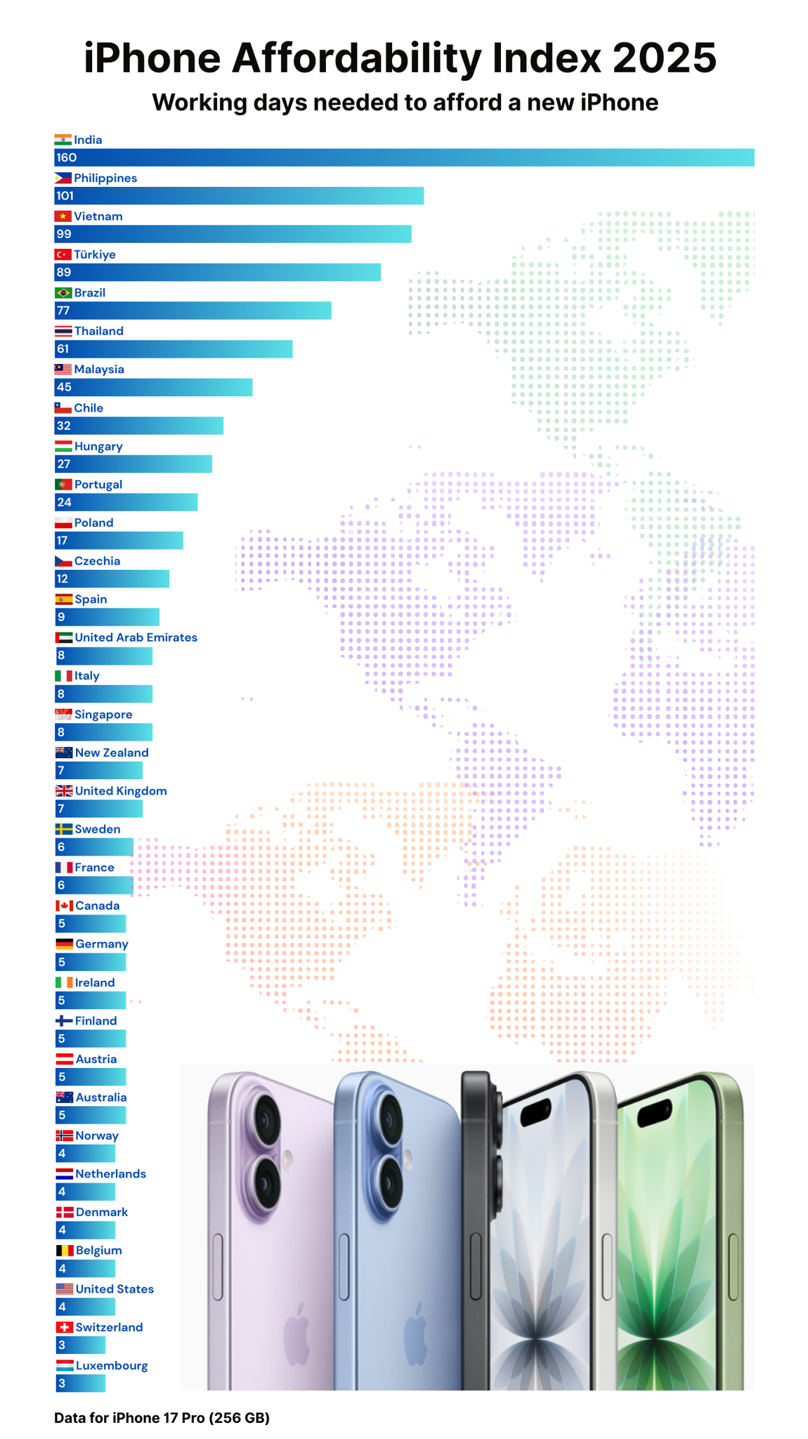 Ở chiều ngược lại, Luxembourg và Thụy Sĩ là hai quốc gia mà người dân chỉ cần ba ngày lương để mua iPhone 17 Pro. Tại Mỹ, Bỉ, Đan Mạch, Hà Lan và Na Uy, người lao động cần trung bình bốn ngày lương để đủ tiền sở hữu mẫu máy này.