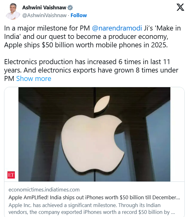Theo tờ Economic Times, Bộ trưởng Đường sắt, Thông tin & Truyền thông, Điện tử & Công nghệ Thông tin Ấn Độ, Ashwini Vaishnav cho hay: 50 tỷ USD là một "cột mốc quan trọng". Ông ghi nhận chương trình "Sản xuất tại Ấn Độ" của chính phủ và cho biết "sản xuất điện tử đã tăng gấp 6 lần trong 11 năm qua".
