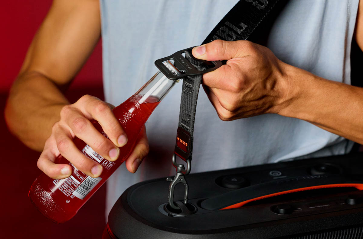 Với kích thước 501 x 258 x 221mm và trọng lượng chỉ 6.36 kg, loa đi kèm tay cầm chắc chắn và dây đeo bản rộng, có tích hợp cả đồ khui bia cực thú vị cho những buổi tiệc ngoài trời. Sự tiện dụng này giúp người dùng dễ dàng mang theo loa trong các chuyến picnic, dã ngoại, cắm trại, ra biển hay hồ bơi.