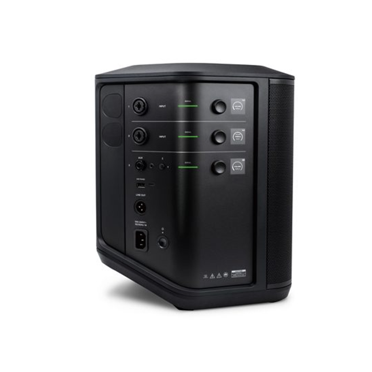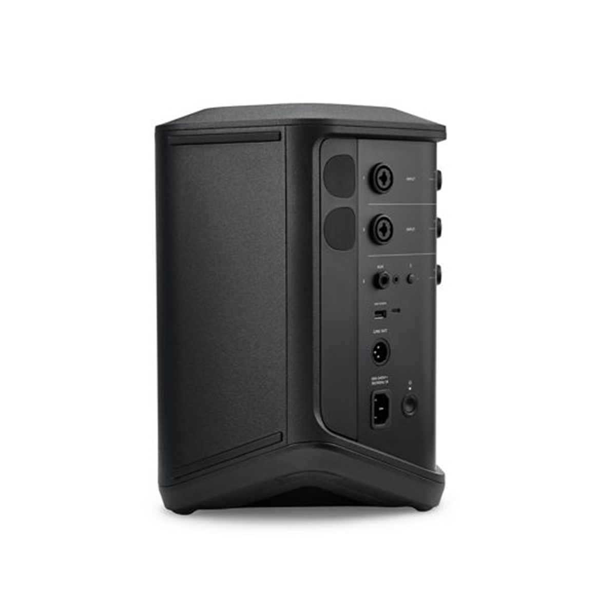 Phía sau thân loa Bose S1 Pro+ (Plus) mới có các phím chức năng cho phép thay đổi âm lượng, âm bổng (treble) và âm trầm (bass) cho từng kênh và truy cập cài đặt cài đặt trước ToneMatch và hồi âm cho Kênh 1 và 2. Thay đổi vị trí và màn hình OLED tự động xoay.