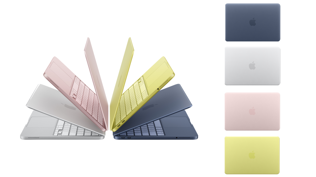 MacBook Neo có bốn màu tuyệt đẹp: bạc, hồng phớt, vàng citrus và xanh indigo.